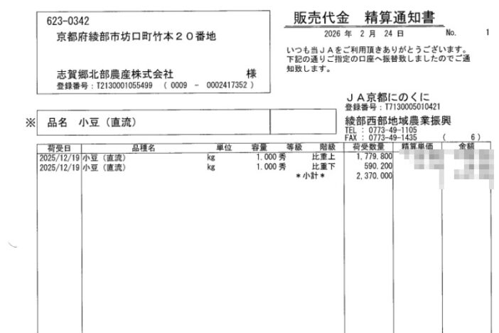 少し前のことになりますが、小豆の販売代金の通知がありました。2025年産の小豆は、・防除のタイミングが遅れてしまってヨトウムシが発生したこと・秋に柵を飛び越えてきたと思われる鹿の攻撃により実が食べられてしまったこと・全体的に莢が収穫適期にな...