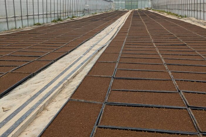 コシヒカリを約1,800箱に播種し、ハウスで育苗します。